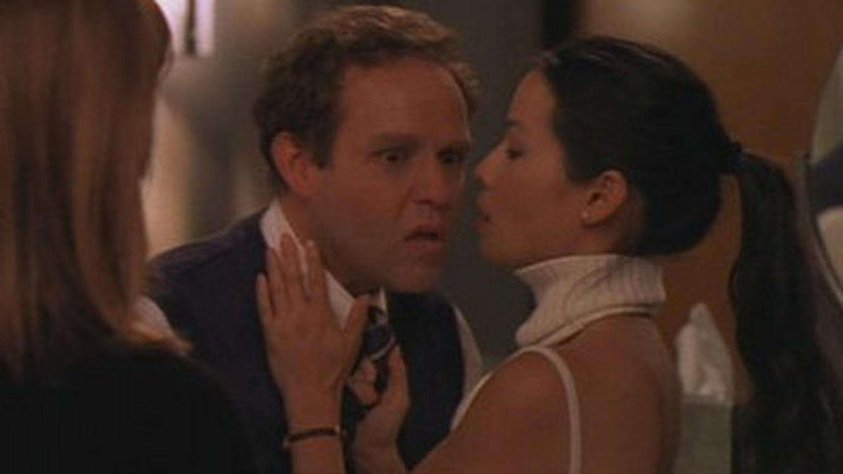 Kimmie comes to Cage & Fish looking to hire Ally. She's suing her old firm for wrongful termination. They fired her for being too puritan, and the opposite lawyer is Larry. Now Ally and Larry have to face each other in court. Meanwhile, Ally is nervous about her first kiss with Larry and seeks for advice with Ling, who demonstrate on John how a good kiss should go. This makes Richard insecure of himself, and Nelle tells him to find a theme song for himself. John loses the case to Larry, but he and Kimmie go out on a date.
