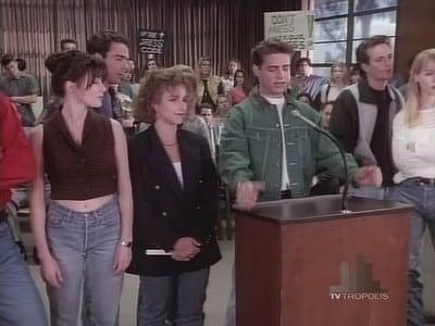 Donna is suspended, and must enroll in summer school before she can graduate. Felice refuses to appeal the ruling because she is worried about her own reputation. Donna changes her mind by reminding her that her husband and Donna forgave Felice for her past mistakes. Brandon is disgusted by the students' apathy, and Gil encourages him to take action on Donna's behalf. Brandon convinces the entire senior class to walk out on finals as a show of solidarity. Dylan doesn't want to participate because he has set his sights on making it into the University of California-Berkeley. The juniors join the protest after Brandon agrees to add the elimination of a proposed dress code to the demands. Everyone (including Dylan) walks out on finals and marches to Donna's hearing. They stand outside shouting, 'Donna Martin graduates!' Despite a plea from Felice and threats from the superintendent, hundreds of students enter the building. At the urging of a surprisingly reasonable board member, the school board votes to let Donna off with a minor penalty, allowing her to attend commencement and graduate with her friends. Music: 'Be-Bop-A-Lula' by Gene Vincent, 'Saturday in the Park' by Chicago.