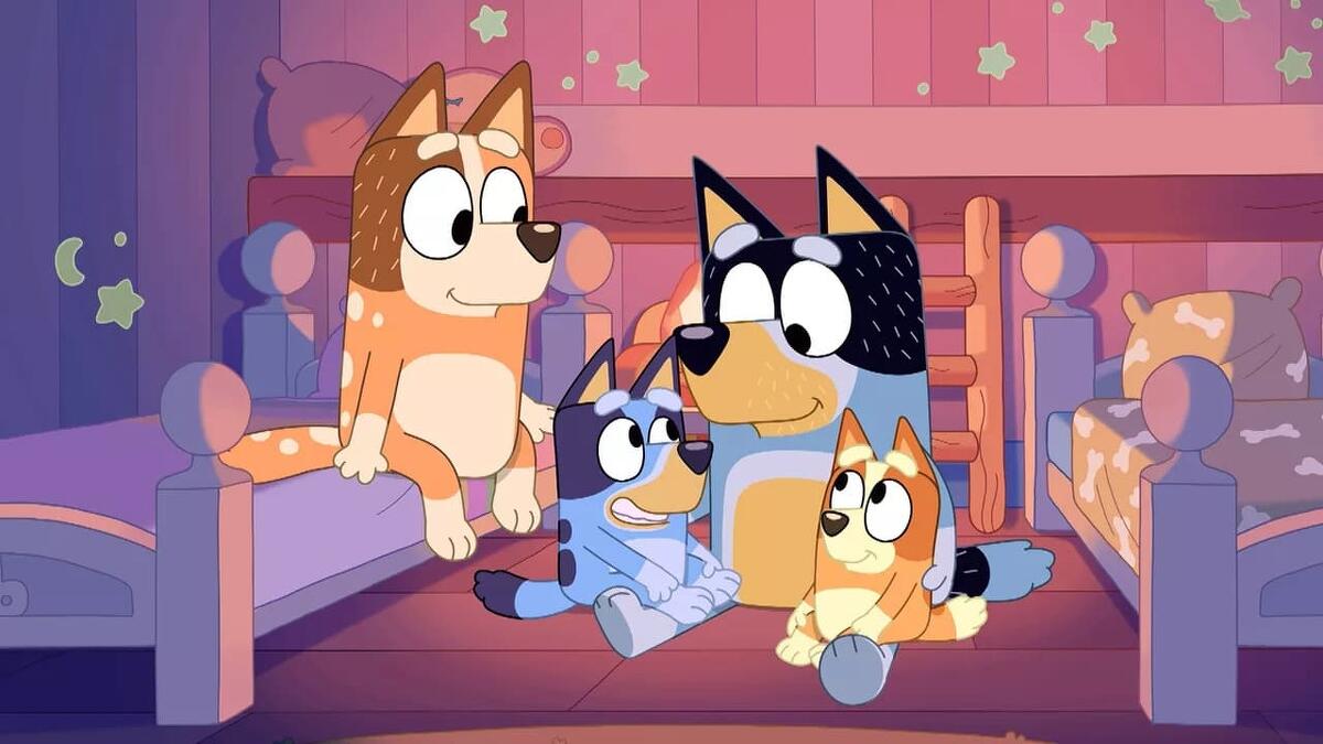 Bluey is an anthropomorphic six-year-old Blue Heeler puppy who is characterised by her abundance of energy, imagination and curiosity of the world. The young dog lives with her father, Bandit; mother, Chilli; and younger sister, Bingo, who regularly joins Bluey on adventures as the pair embark on imaginative play together.