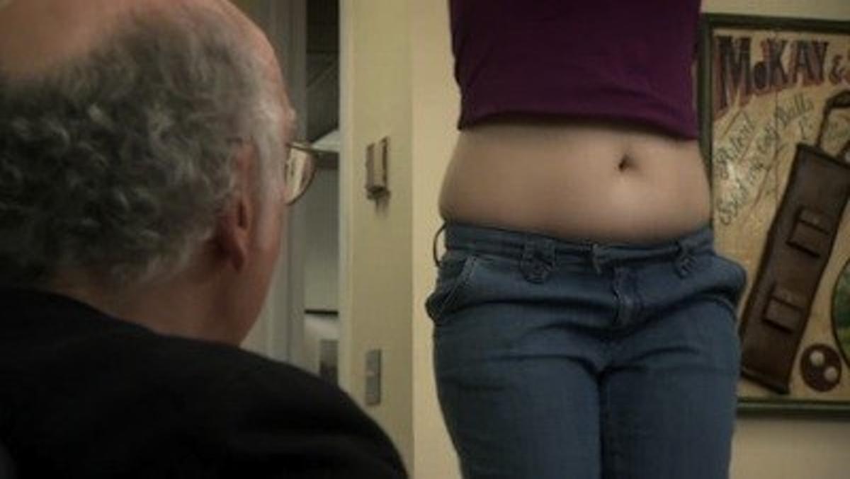 Jerry Seinfeld and Larry are put off by a flabby assistant wearing a shirt that exposes her midriff, and some errant urine from Larry leads her to think a picture of Jesus is crying.