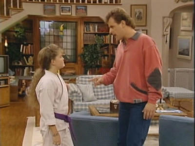Teaser: Jesse is weight training with Michelle "Superbaby" Tanner. Main Synopsis: While Danny and Jesse are out, Joey is left in charge of the girls. D.J. and Stephanie want to stay up late so they can watch a Tiffany concert on TV. When Danny comes home and sees that they are up late watching the concert, Danny tells Joey that whenever Joey is at home alone with the girls, he needs to make them follow the rules of the house, so on the next day, D.J. arrives home from school an hour late without telling Joey that she was with friends, practicing for an hour for an upcoming karate tournament, and Joey grounds D.J. - for the weekend when the tournament is scheduled to take place. D.J. becomes furious, angrily reminds Joey that he's not her father, and then storms off to the bedroom that she and Stephanie occupy. Later, Joey goes upstairs to the bedroom, where he explains that after school, during the hour when he didn't know where D.J. was, he was scared to passing. D.J. agrees that she
