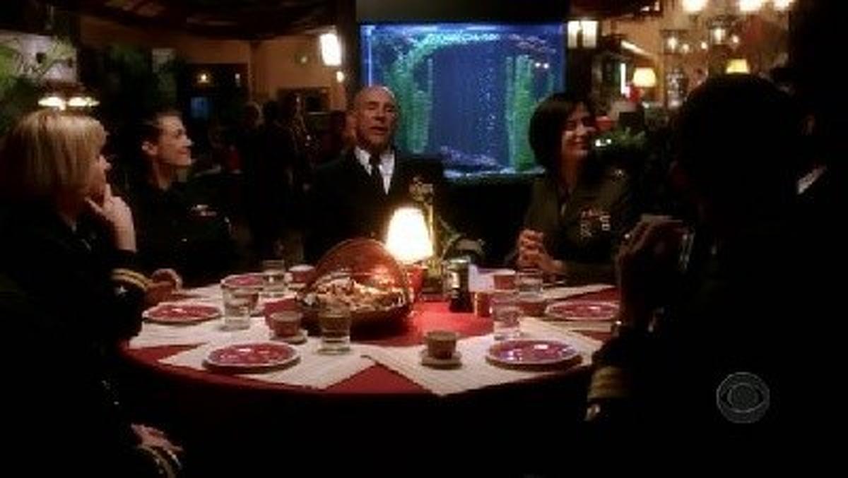 Members of the "JAG" staff are "helped" along to discover their true inner feelings while celebrating Jennifer Coates promotion to Petty Officer 1st Class.