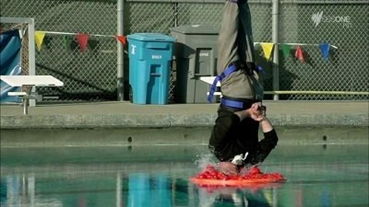 The MythBusters go to vertigo-inducing heights to test out some commercial myths. Could you actually bob for an apple while jumping from a 100-foot high bungee cord? And from a viral video, could you really play a match of tennis while both players are standing on top of an airplane's wing?.