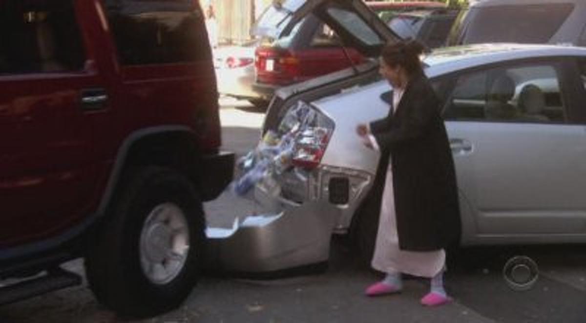 Christine's Prius and Marly's SUV back into each other. While she's upset at Marly's continued superior attitude over the situation, she's more upset at there only being an SUV available at the rental agency.