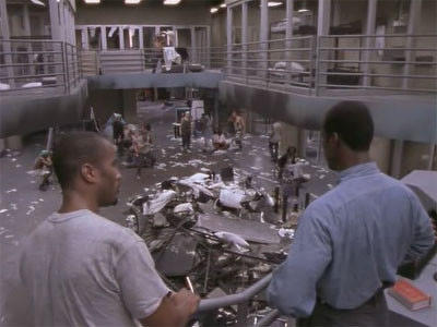 Beecher is released from the hole and Schillinger is left eyeless and weak. A riot breaks out after two white punks get into a fight over checkers. Frustration, sexuality, hate, revenge, racism all rear their ugly heads, causing the violence to escalate. Finally, after several prison officers are taken hostage, tear gas is thrown into the Emerald City and the SORT team arrives,balloons blazing.