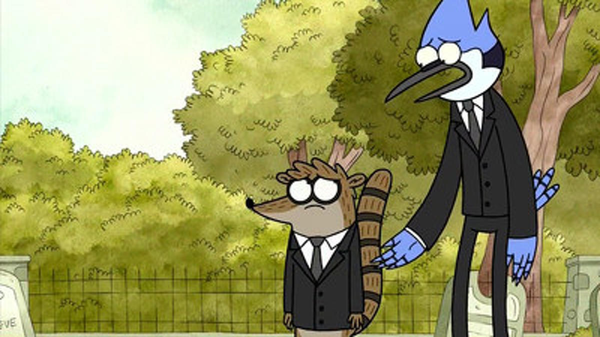 Two groundskeepers, Mordecai (a six-foot-tall blue jay) and Rigby (a hyperactive raccoon) are best friends who spend their days trying to entertain themselves by any means necessary, much to the displeasure of Benson (their boss, who is a gumball machine) and to the delight of Pops (an older, lollipop-headed gentleman).
