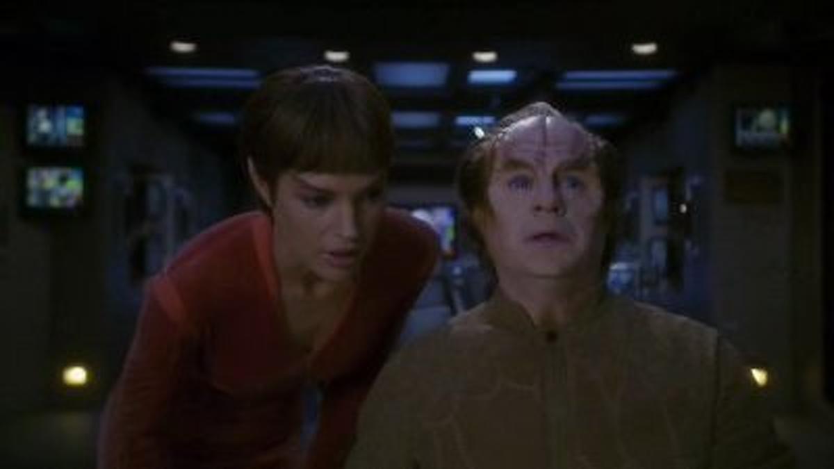 En route to Azati Prime, Archer and his crew encounter another roadblock: a trans-dimensional disturbance. To pass through it could prove deadly for the crew, but going around it means another two-week delay. Luckily, Phlox has a solution. He will place each crewmember in a comatose state, so as to protect their neocortexes while they traverse the anomaly. Because Phlox's Denobulan physiology is immune to the effects of the disturbance, he plans to remain conscious and watch over the ship and crew. As there's no way of knowing what effects the disturbance will have on Enterprise's warp drive, Trip recommends leaving the ship at impulse, meaning Phlox will have to keep the crew sedated for at least four days. Phlox is briefed on how to perform various tasks in case of an emergency - Mayweather gives him a quick helm tutorial while Trip instructs him on checking the warp engines. Various crewmembers express their concern about Phlox running the ship, because he lacks Starfleet training, but Archer is confident the doctor can handle things.
