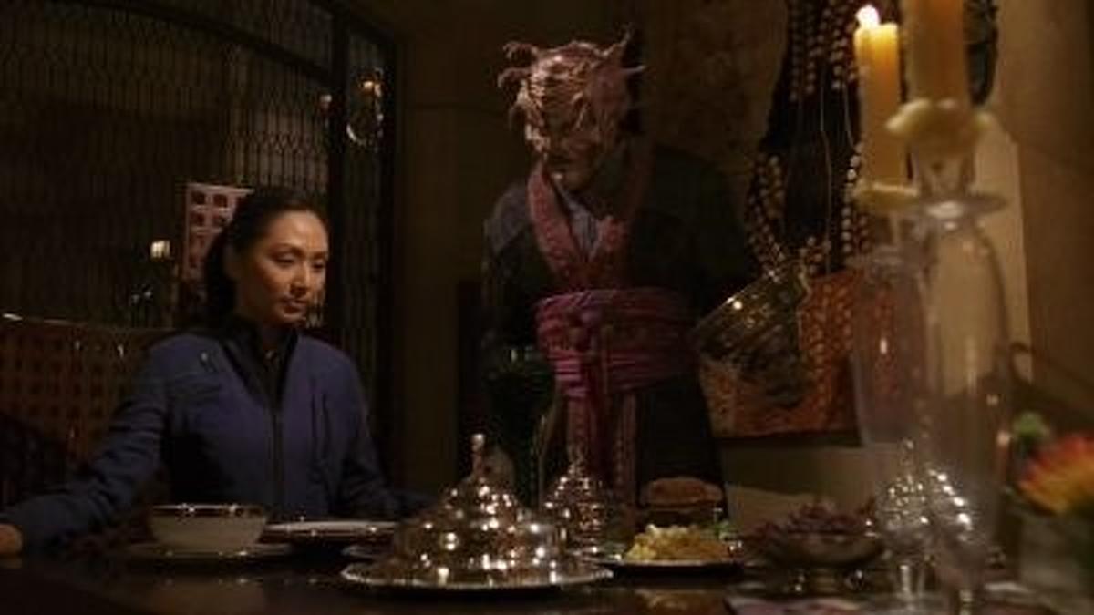 Hoshi is in her quarters one night when she hears whispering and spies a mysterious figure lurking in the shadows. She alerts Reed, but when she turns back to the figure, it has disappeared. Reed scans for intruders, but nothing turns up. Later, as Hoshi attempts to translate some of the Xindi database, she once again hears voices and sees the mysterious figure. She also has a vision of being in a strange alien sanctuary. Alarmed, Hoshi visits Phlox, who examines her but doesn't find anything out of the ordinary. As they talk, the mysterious alien presence once again visits Hoshi - in the form of Phlox. He tells her that he's been studying her mind for several days and that he has a form of telepathy that only works in rare instances. He also tells her that he knows Enterprise is on an urgent mission and would like to talk to her about it.