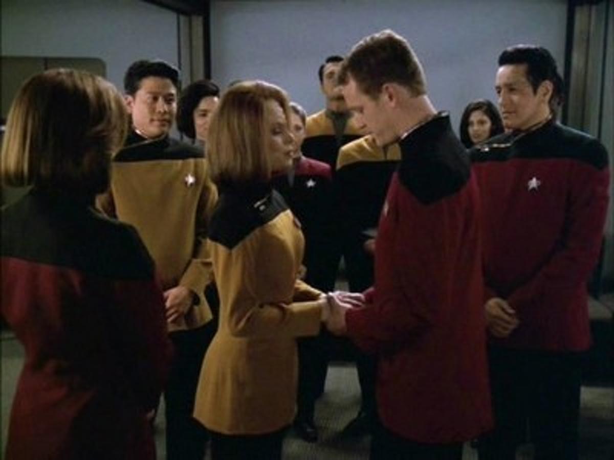 Stardate: 52586.3 Paris and Torres share their wedding vows, but when strange cohesion problems occur on Voyager, it appears things are not what they appear.