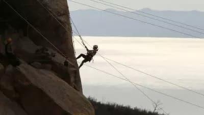 As the final three teams race from Shenzhen, China to Santa Barbara, California for the final leg of the Race, they face a gut-wrenching leap of faith: jump off a building more than 150 feet high and perform a harrowing task of synchronized mountaineering.